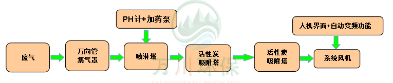 廢氣從氣體收集系統(tǒng)收集后,進(jìn)入水噴淋塔,經(jīng)濕式旋流板廢氣塔進(jìn)一步清洗處理后,通過加壓引風(fēng)機(jī)引入活性炭吸附裝置,由于固體吸附劑表面上存在著未平衡和未飽和的分子引力或化學(xué)鍵力,因此當(dāng)吸附劑的表面與氣體接觸時(shí),就能吸引氣體分子,使其濃聚并保持在吸附劑表面,此現(xiàn)象稱為吸附。利用吸附劑固體表面的吸附能力,使有機(jī)廢氣中的VOC與大表面的多孔性吸附劑相接觸,廢氣中的污染物被吸附在固體表面上,使其與氣體混合物分離,進(jìn)入活性炭吸附裝置,去除有機(jī)廢氣及刺激性異味氣體后經(jīng)排氣筒高空排放。