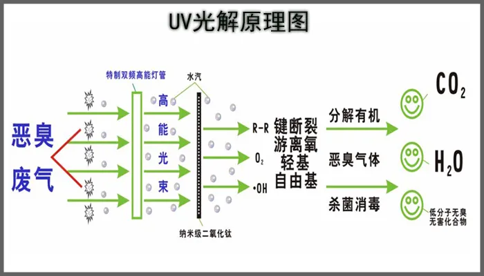 (1)、利用特制的高能UV紫外線光束照射惡臭氣體,裂解惡臭氣體的分子鍵,降解轉變為低分子化學物,如二氧化碳和水等物質。