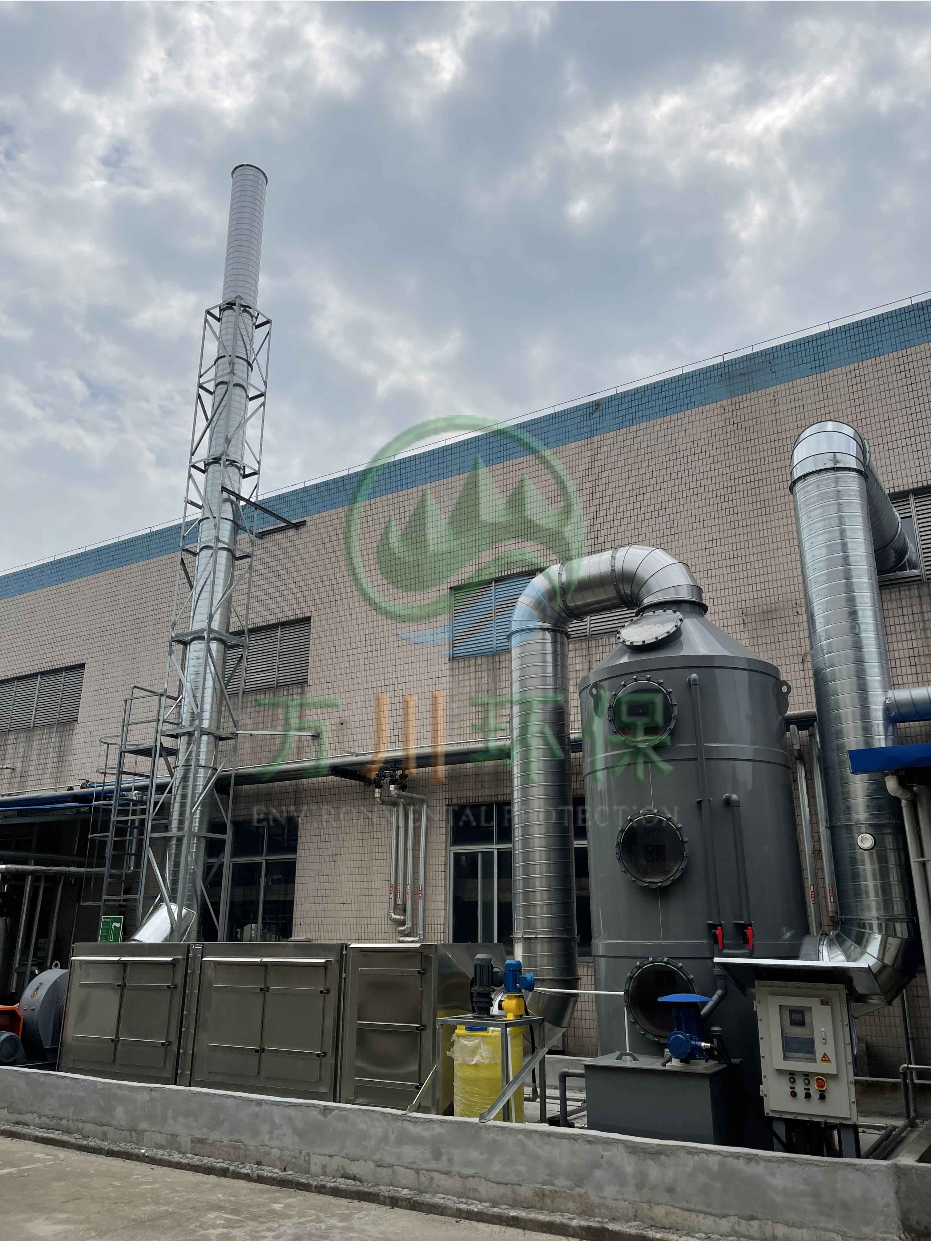 根據廢氣類型和場地需求我們采用噴淋塔+兩級活性炭對其進行處理。反應釜廢氣處理配套一臺17170風量pp噴淋塔+兩臺17170風量的不銹鋼材質活性炭吸附塔+干式過濾與大功率防爆離心風機+自動化電控柜系統。
