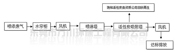 根據廠方提供的資料及現場勘察的情況。其噴漆廢氣的來源主要為無塵噴漆車間內的5條自動噴涂線。在生產過程中有噴漆,該工序產生了一定量含三苯有機廢氣和噴漆粉塵,該廢氣不僅對環境造成污染,而且對人體有較大的危害作用,同時也破壞了周邊的環境,造成了不良的影響,需進行處理后排放。我們工程師分析了該廢氣的特點和以往的案例經驗,采用了“水簾柜+噴淋塔+活性炭吸附塔”這套解決方案。