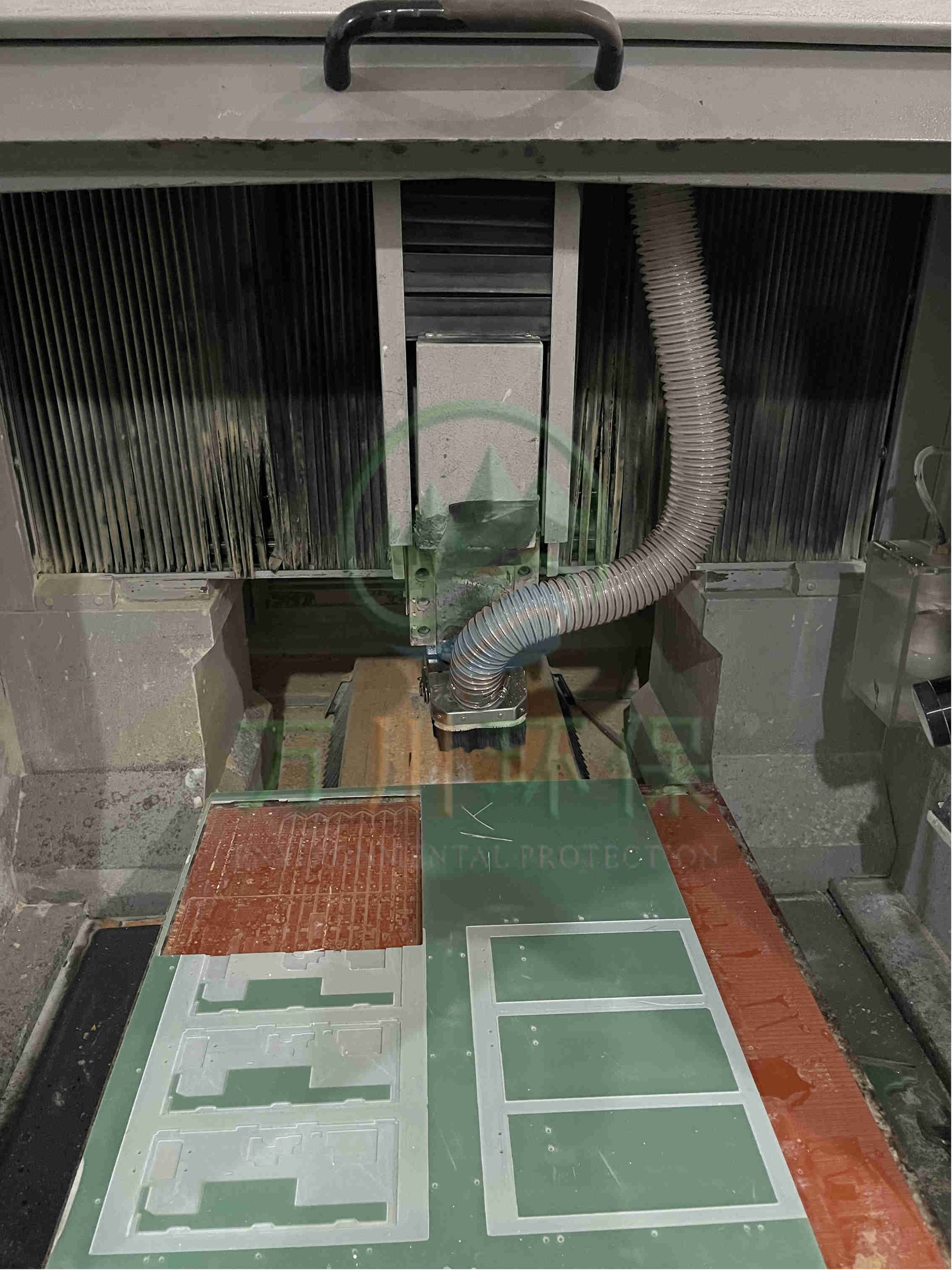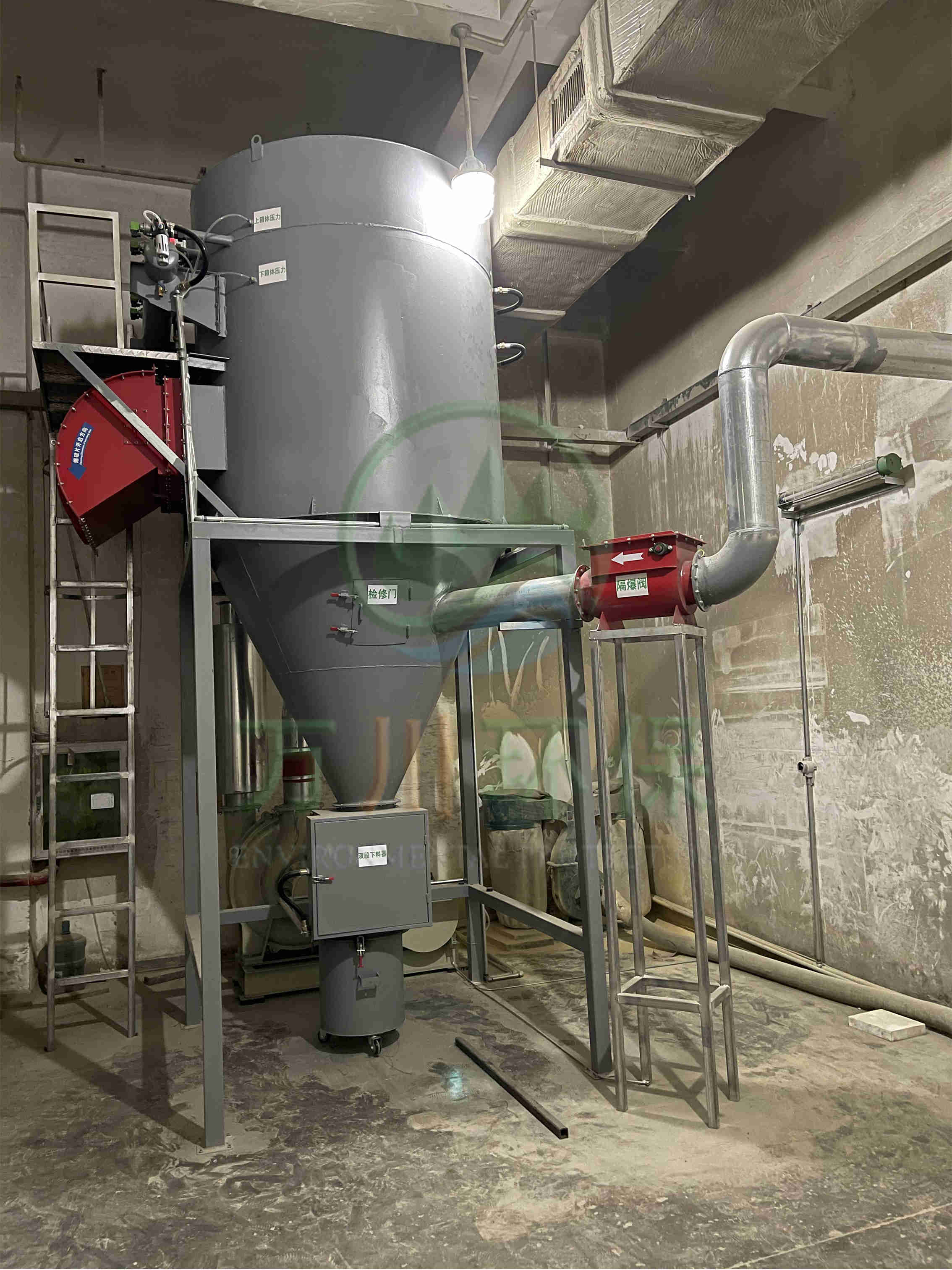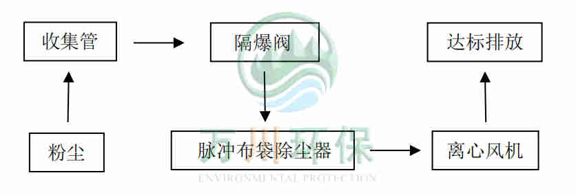 精雕機工作時產生的粉塵通過集氣罩、吸塵軟管進入到脈沖布袋除塵器中過濾凈化,粉塵落入灰斗,凈化后的廢氣通過系統風機達標排放。