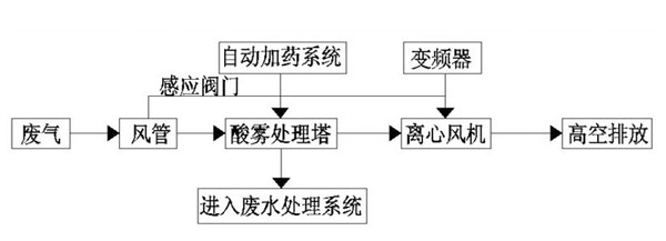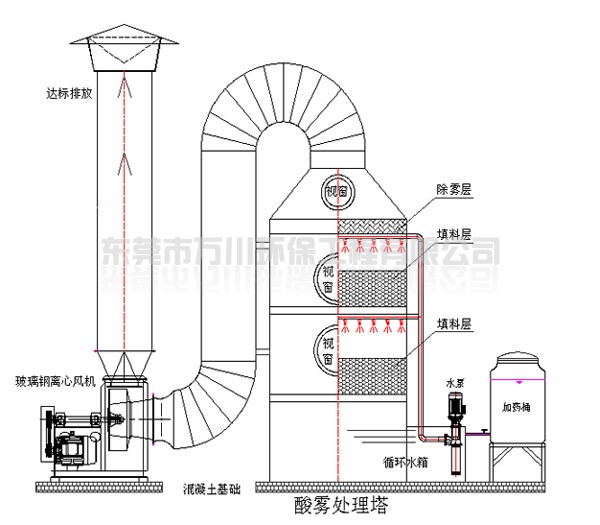 酸霧廢氣由風管進入酸霧處理塔,自下而上穿過填料層;循環堿液吸收劑由塔頂通過螺旋噴嘴,形成的水霧勻地噴淋到填料層中,沿著填料層表面向下流動,進入循環水箱。由于上升氣流和下降霧化吸收劑(堿液)在填料中不斷接觸,上升氣體中流質的濃度越來越低。使其酸霧得到凈化,達標排放。