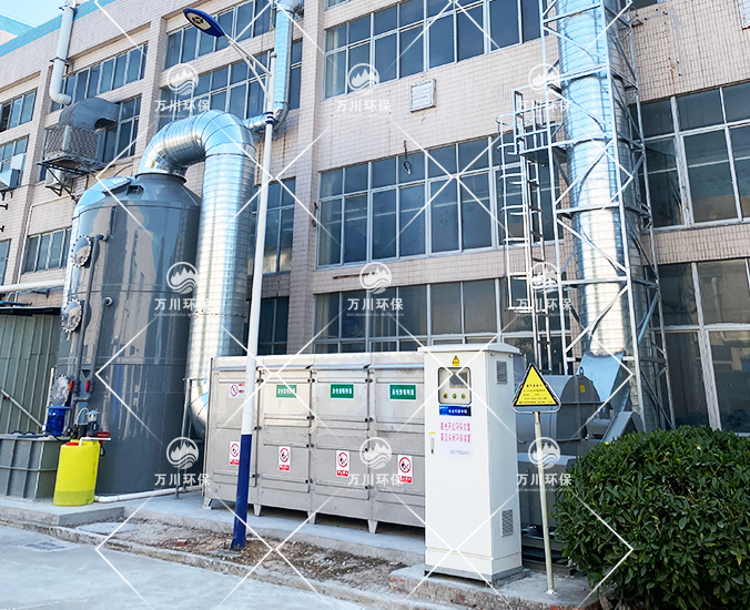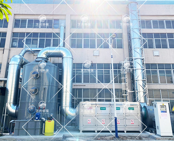 廢氣和粉塵經過集氣罩吸入至風管,以負壓的形式進入到噴淋吸收塔內,廢氣和粉塵進入塔內,塔內噴出吸收液,吸收液在填料層液膜,廢氣和粉塵充分地與液膜接觸,處理后的氣體經過塔頂的除霧層干燥后,可以直接排放或者進入后續(xù)的廢氣處理設備中進行處理。
